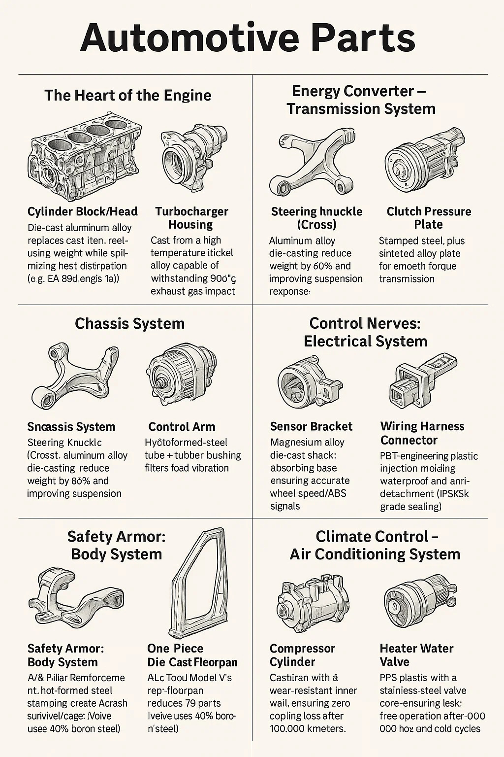 Phụ tùng ô tô bao gồm hàng trăm đơn vị chức năng tạo nên một chiếc xe, được phân loại thành sáu hệ thống chính.