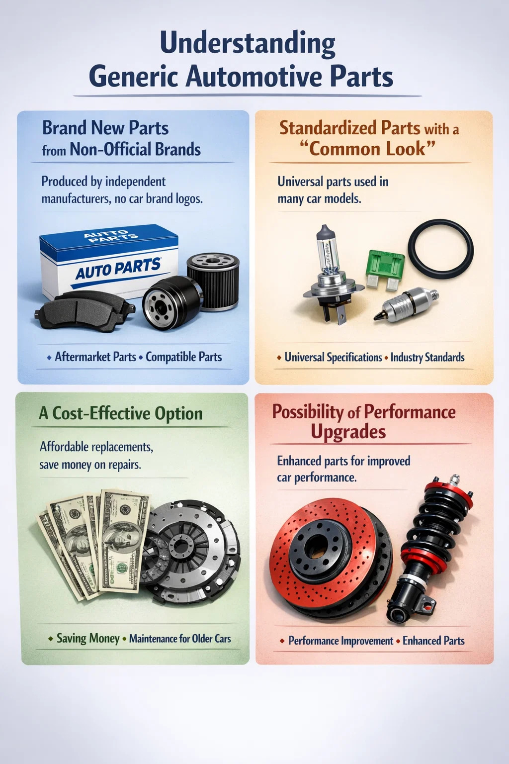 "Các bộ phận chung" hoặc "các bộ phận thay thế thương hiệu" là những gì chúng ta thường gọi là phụ tùng ô tô không phải do nhà sản xuất ô tô trực tiếp sản xuất nhưng có thể lắp đặt hoàn hảo trên ô tô. Bạn có thể coi chúng như những loại “thuốc generic” trong ngành dược phẩm hay “phụ kiện bên thứ ba” dành cho điện thoại di động.