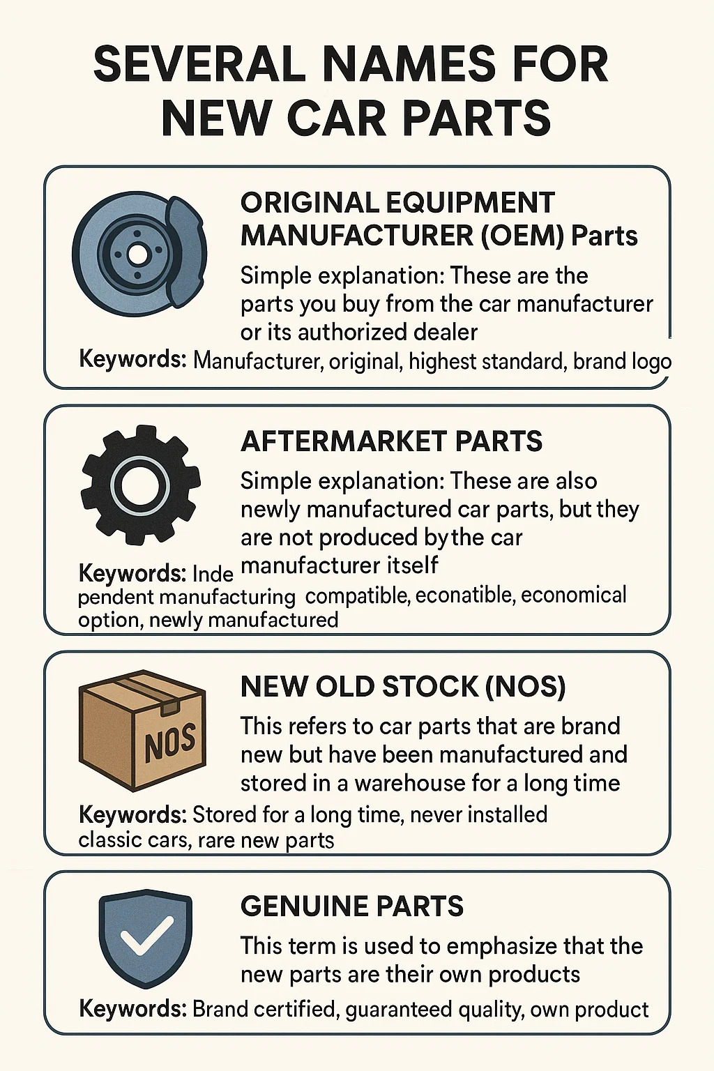 Thương hiệu mới phụ tùng ô tô có một số tên phổ biến, hơi khác nhau tùy thuộc vào nguồn gốc và tính chất của chúng.