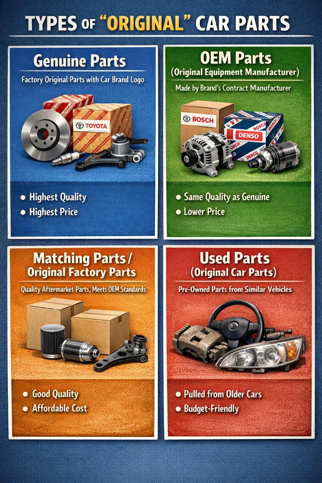 Giải thích đơn giản: Mặc dù chúng tôi đang tìm kiếm các bộ phận nguyên bản, nhưng đôi khi thị trường cũng gọi các bộ phận được lấy ra từ những chiếc xe cũ tương tự là "phụ tùng ô tô nguyên bản". Mặc dù những bộ phận ô tô này thực sự ban đầu được sản xuất bởi các nhà máy, nhưng chúng không còn là những bộ phận mới nữa mà là những bộ phận đã qua sử dụng.